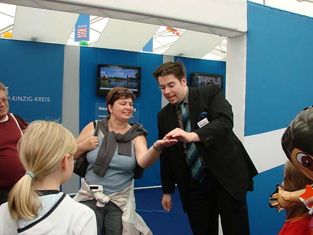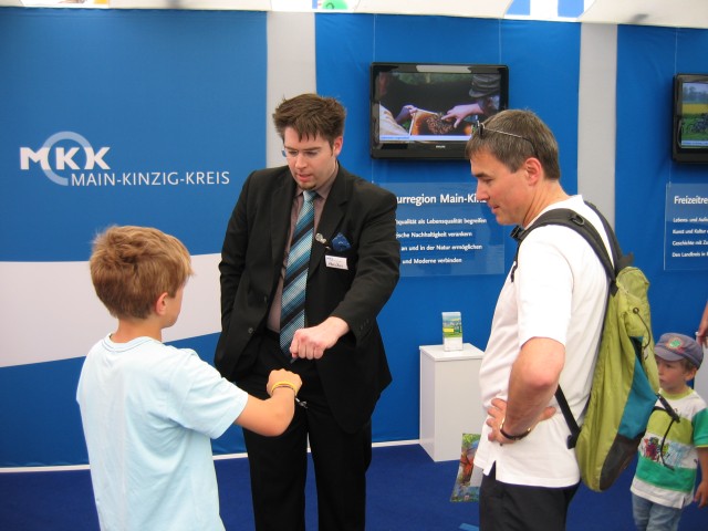 Im Eingangsbereich der Ausstellung sorgte AbraXas für Aufmerksamkeit. Er sorgte regelmäßig ohne feste Uhrzeiten für Menschenaufläufe und Bewegung in der Ausstellung. In der Messezauberei, die Showcharakter hatte, aber ohne festen Zeitpunkt oder Verstärkung der Stimme auskam, machte er auf die Ausstellung neugierig. Die täglich wechselnden Themen, verzauberte AbraXas passend und mit Hintergrundinformation.