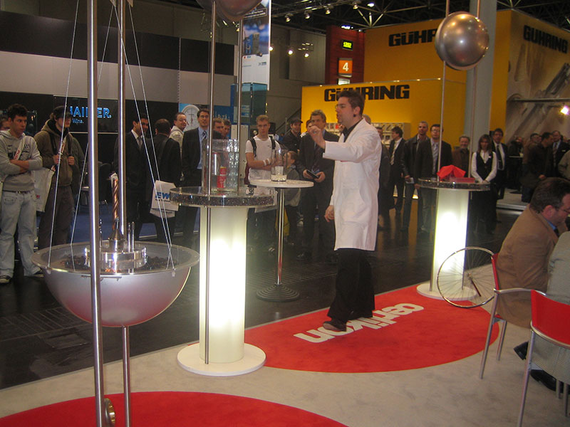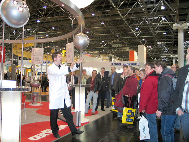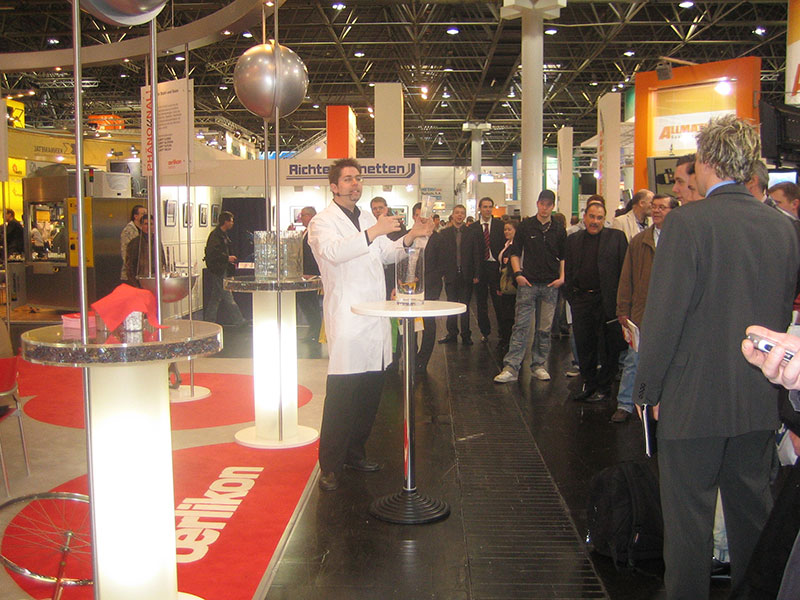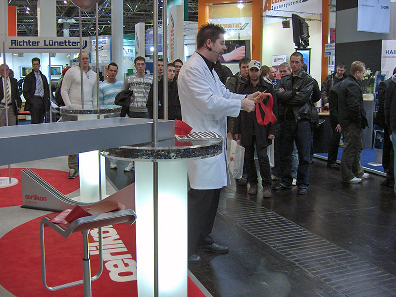 „Phänomynale“ physikalische Aha-Momente zogen in der Messezaubershow die Besucher der Messe für Metallverarbeitung an den Stand der Oerlikon Balzers Coating Germany GmbH, die Werkzeuge und Bauteile mit Kunststoffbeschichtungen veredelt. Die Beschichtungen sind nur wenige Mikrometer (die Abkürzung dafür ist ein „m“ mit dem griechischen Buchstaben „my“ davor) dick und sorgen für glattere Oberflächen. Dadurch wird die Reibung reduziert und das Werkzeug kann länger oder mit höherer Belastung eingesetzt werden.